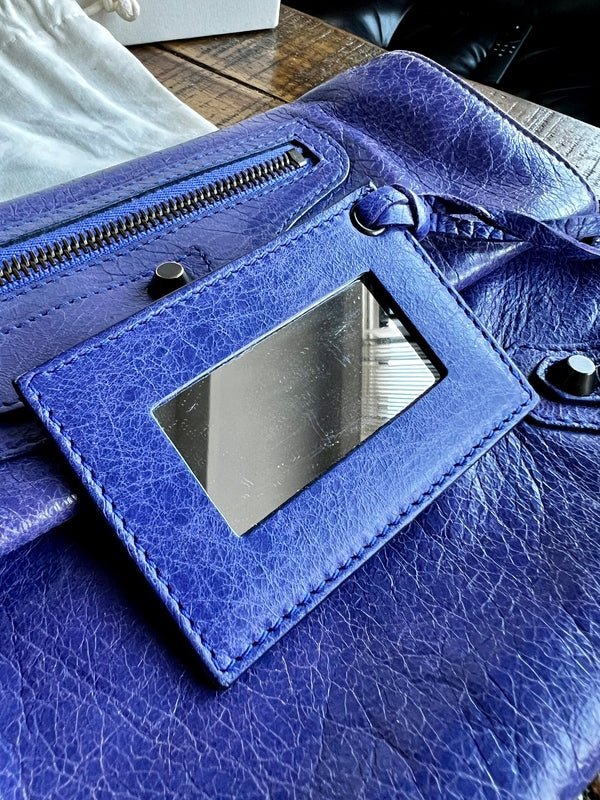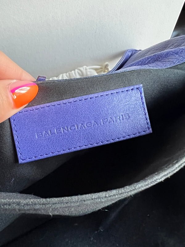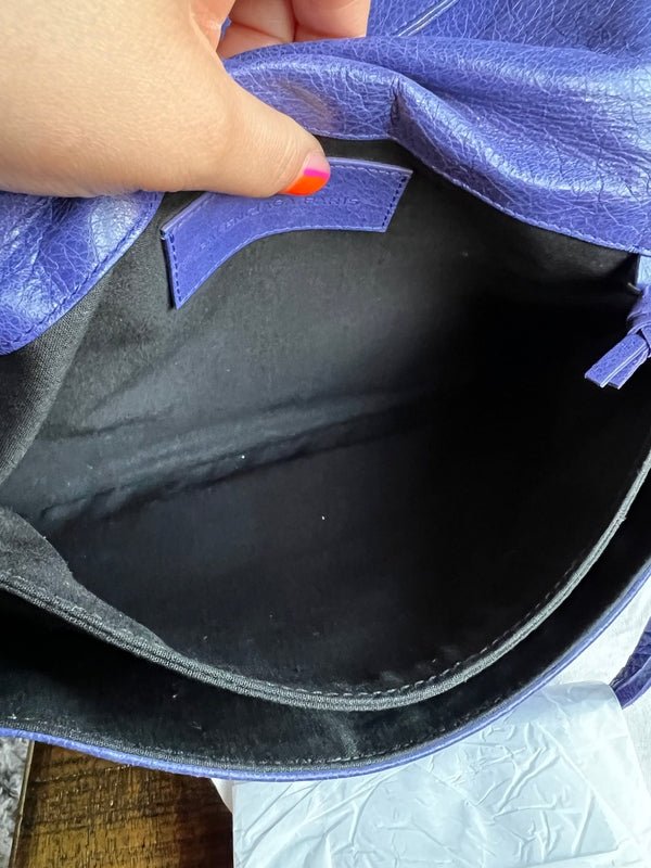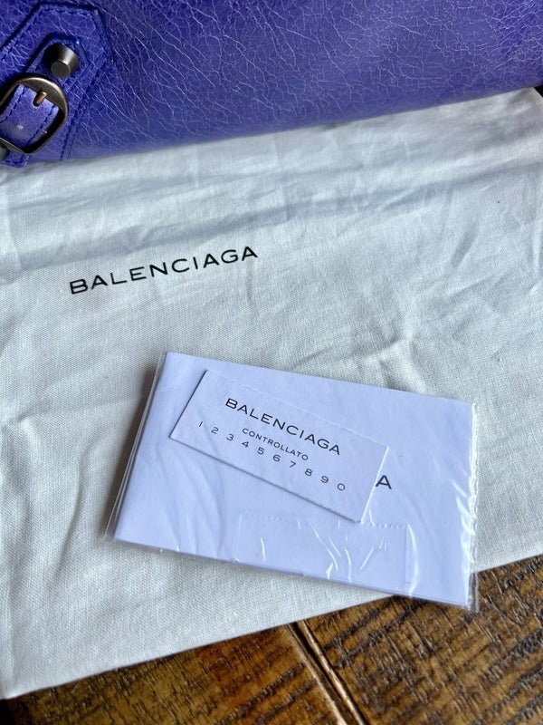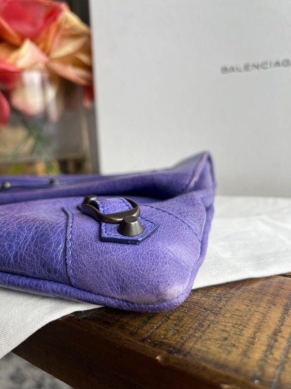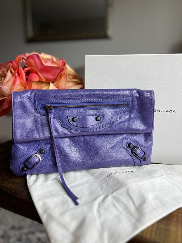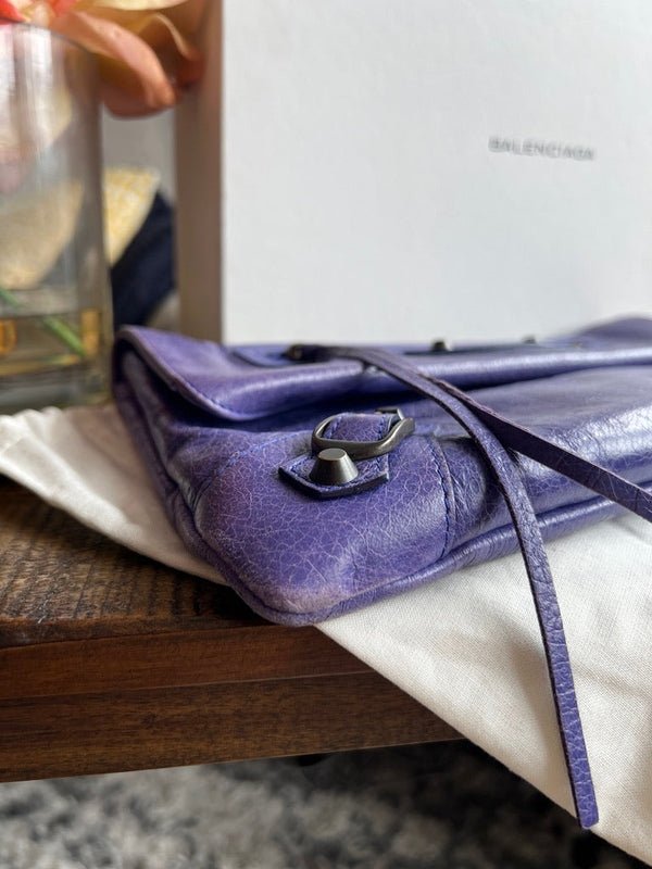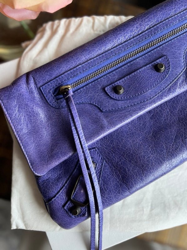 Experience the timeless elegance of the Balenciaga City Envelope Clutch in a stunning shade of purple with gunmetal hardware. Made from buttery soft lambskin leather, this clutch embodies the classic, worn-in look of Balenciaga's iconic city bags and includes the signature lipstick mirror. Bag can be converted to a wristlet with an interior d-ring.