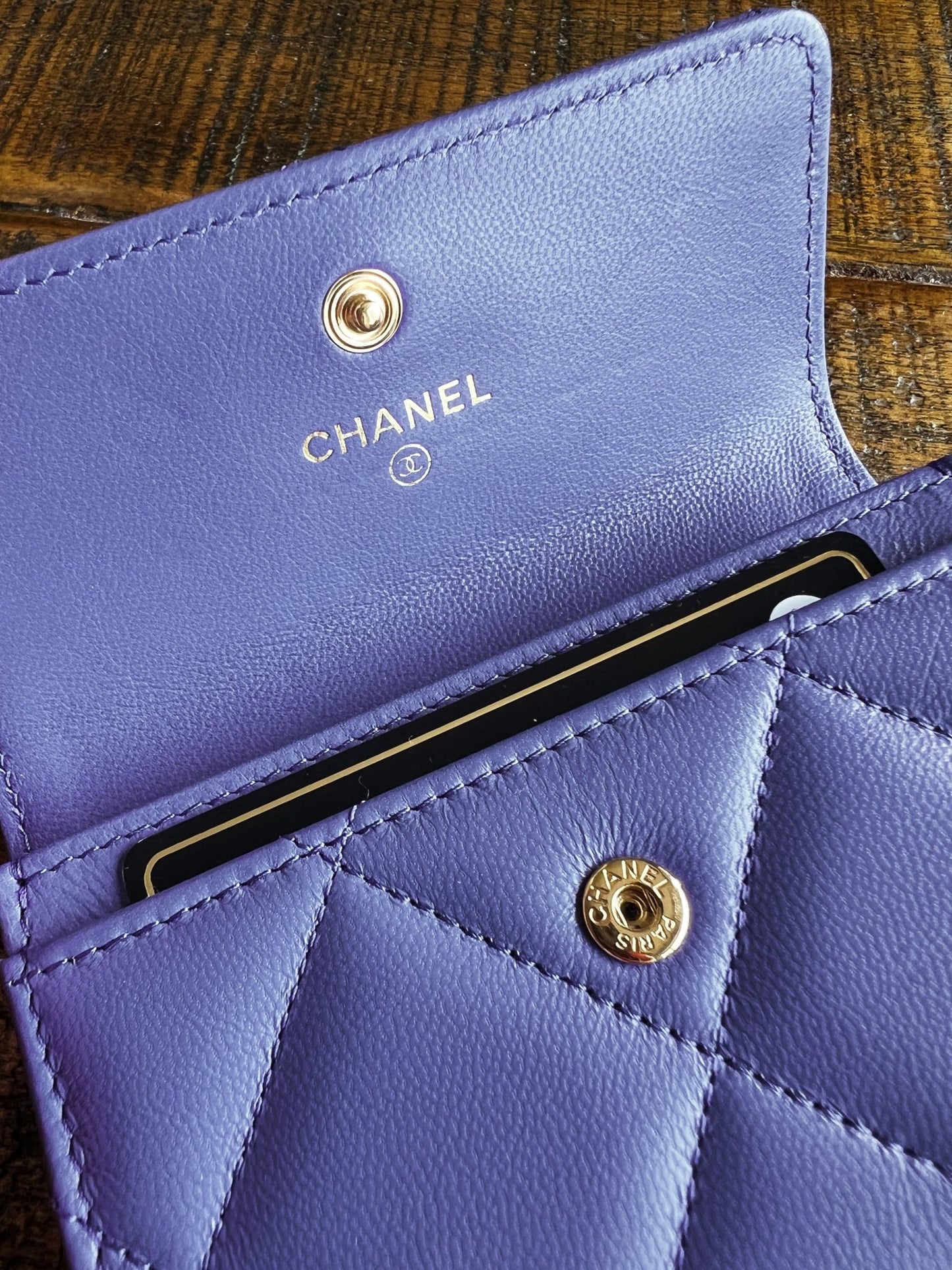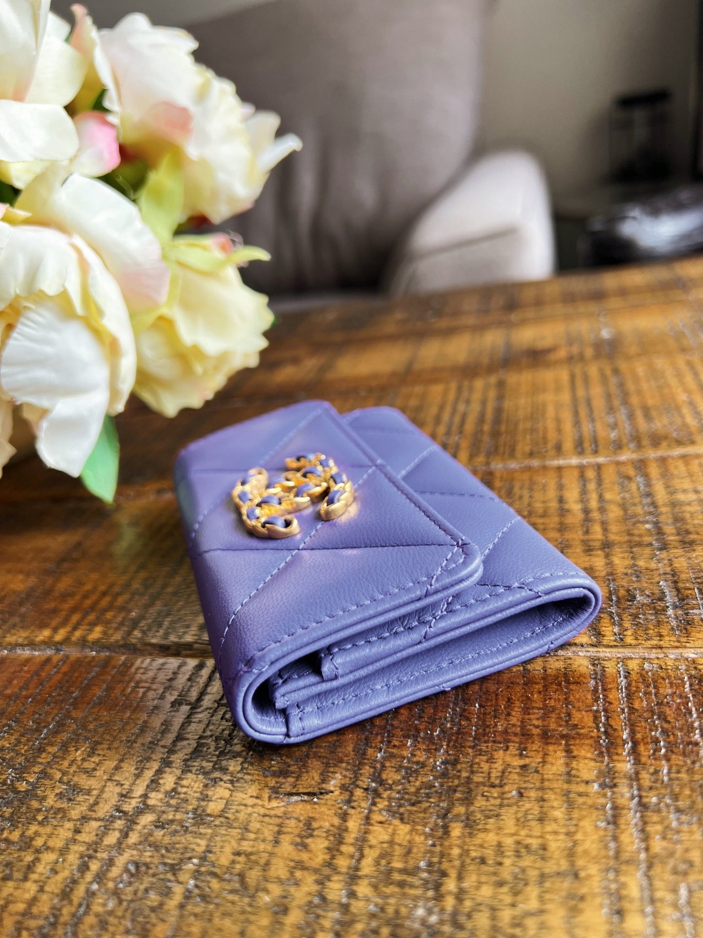 This Chanel 19 Flap Card Holder is crafted from luxurious quilted lambskin leather in a stunning shade of soft violet. It features the iconic Coco Mark logo with chain detailing in gold-tone hardware. Its compact design is perfect for carrying cards and small essentials, offering both style and practicality. This card holder is from the 30-series, and the hologram sticker is intact. It comes with the original authenticity card as well as a third-party certificate of authenticity (COA).